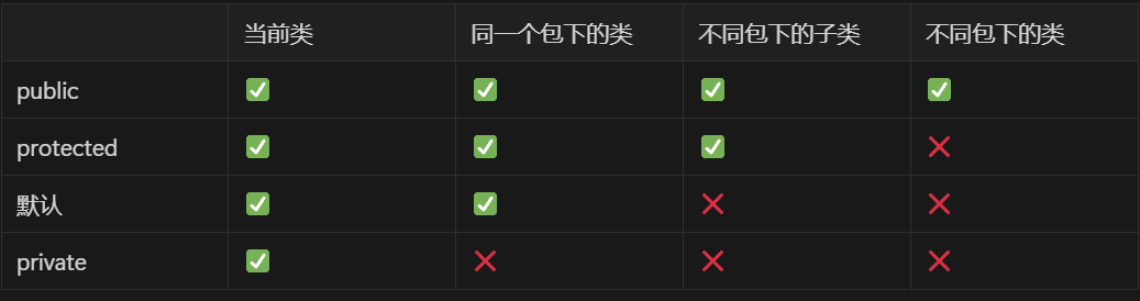 - protected:标记为受保护的内容可以能被类本身和同包中的其他类访问,也可以被子类访问(继承)。