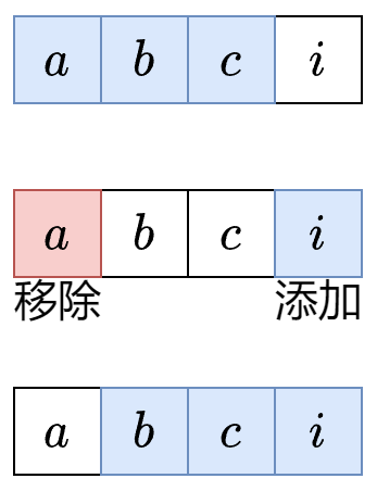 对于下图的字符串 abci,假如我们已经计算出了子串 abc 的元音个数,那么从子串 abc 到子串 bci,只需要考虑移除(离开窗口)的字母 a 是不是元音,以及添加(进入窗口)的字母 i 是不是元音即可,因为中间的字母 b 和 c 都在这两个子串中。